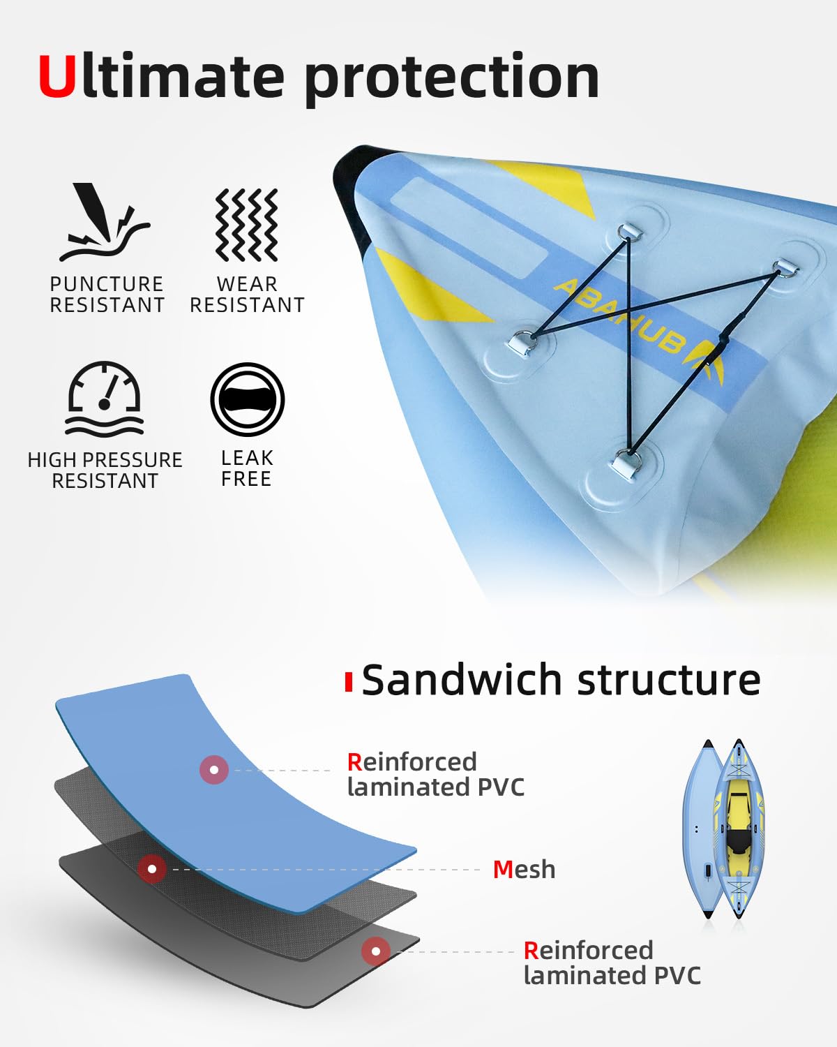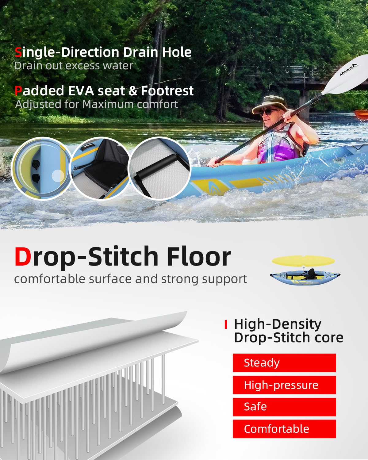 - 【Geschützte Reise】 Das Abahub Kajak besteht aus strapazierfähigen Vinylmaterialien mit einem Tropfstiftboden(Drop-Stitch-Boden), um die Steifigkeit zu erhöhen, die den unerwarteten Elementen im Freien standhält. Der 3-Kammer-Kontraktor sorgt für zusätzliche Sicherheit. Halkey-Roberts-Ventile halten einem besseren Druck stand, sind einfach zu bedienen und leckagefrei. Mehrere Sicherheitsvorkehrungen, die Ihnen helfen, sicher zu kajakfahren