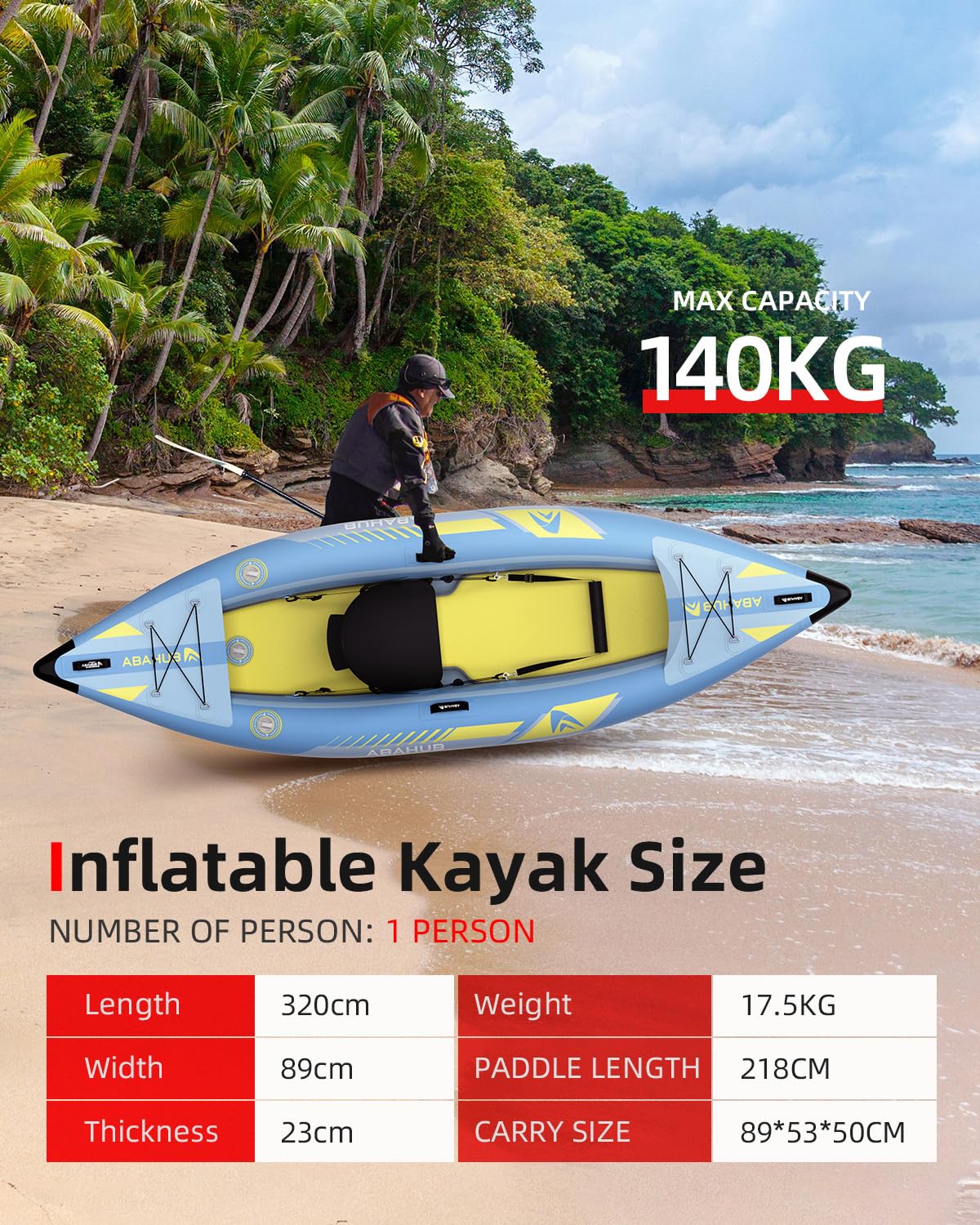 - 【V320 1-PERSON】 Die aufblasbare Größe des Kajaks beträgt 320 x 89 x 23 cm mit einer Tragfähigkeit von 140kg und lässt sich leicht zusammenfalten, um in die mitgelieferten Tragetasche gesteckt zu werden, die bequem transportieren ermöglicht.Genießen Sie das Kajakfahren und sogar das Wandern in abgelegenen Gebieten. Das Kajak ist aus strapazierfähigem Vinyl gefertigt, wird das Kajak länger bei Ihnen sein